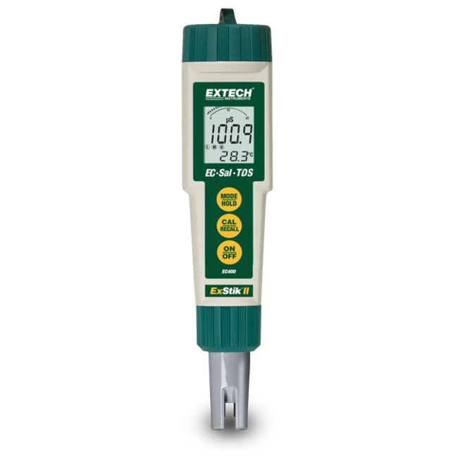 L'Extech EC400 ExStik® dispose de six unités de mesure, d'une mémoire interne pouvant stocker jusqu'à 15 mesures étiquetées pour un rappel facile, d'un facteur de conductivité réglable de 0,4 à 1,0 et d'un auto-étalonnage à la mise sous tension. Lire plus.