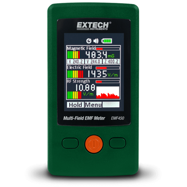 L'EMF450 est un appareil de mesure EMF 3 en 1 pratique qui mesure et affiche simultanément le champ magnétique, le champ électrique et la puissance des radiofréquences. Lire plus.