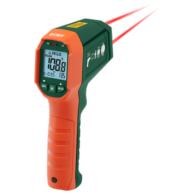 Ce thermomètre est doté d'un boîtier robuste, étanche (IP65) et résistant aux chutes (3 m). L'Extech IR320 fournit des mesures de température rapides et précises jusqu'à 650 °C. Le double laser affiche la zone de mesure entre les deux points, avec un espacement de 12:1. Ce thermomètre dispose d'alarmes programmables de seuil haut et bas, signalées par des LED rouges (seuil haut) et bleues (seuil bas).