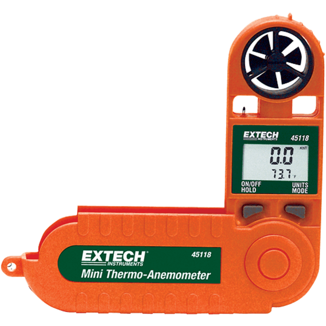 De Extech 45118 is een waterdichte zakformaat thermo-windmeter voor metingen van luchtsnelheid, temperatuur en gevoelstemperatuur. Geeft tegelijkertijd luchtsnelheid en temperatuur of gevoelstemperatuur weer op het LCD-scherm. Selecteerbare middelingsfunctie van intervallen van 5, 10 of 13 seconden. Beschikt over Data Hold functie met automatische uitschakelfuncties. Wordt compleet geleverd.
