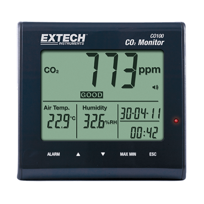 De Extech CO100 meet koolstofdioxide (C02), luchttemperatuur en luchtvochtigheid. Een CO₂ meter (ventilatiemeter) voor monitoring van de luchtkwaliteit binnenshuis. Lees meer.