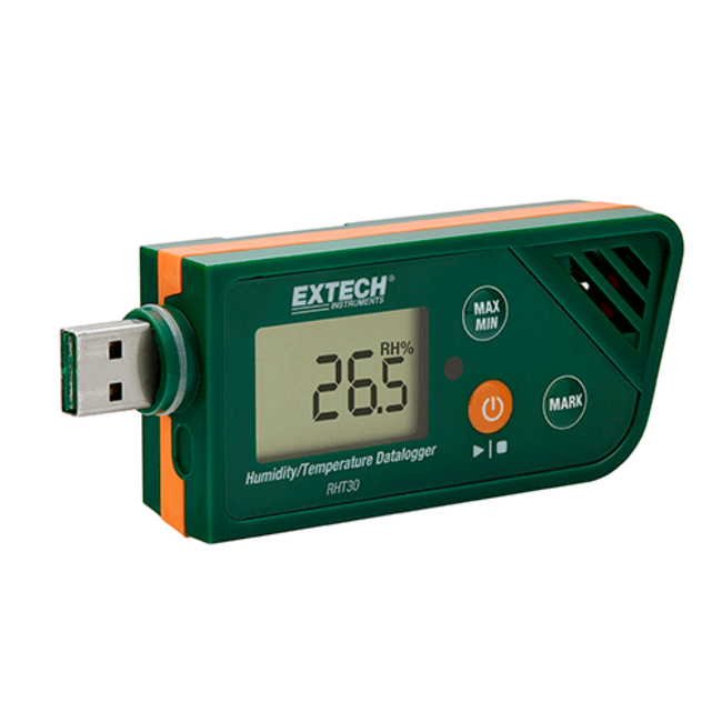 De datalogger is ontworpen met een robuuste behuizing en een standaard USB-connector waar opgeslagen metingen (tot 48.000 gegevens) gemakkelijk naar een pc worden overgebracht in PDF- of Excel®-spreadsheetformaat wanneer deze is aangesloten. Extra functies zijn onder meer een loggerbladwijzer met 8 locaties, 6 -taalopties, programmeerbaar bemonsteringsinterval, instelbaar alarm en wachtwoord beveiligde inloggegevens. Groot LCD-scherm optimaliseert de weergave en de slimme LED biedt kleurgecodeerde vochtigheid en temperatuuraflezing.