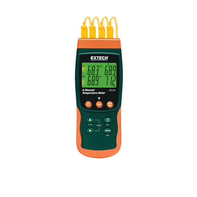 De Extech SDL100 is een 4-kanaals temperatuur meter/datalogger voor het meten en registreren van de temperatuur via 4 x thermokoppels (Type J, K, E, T, R, S) en 2 x PT100 temperatuur sensoren, ideaal voor bijvoorbeeld het inregelen van vloerverwarming. Het interne geheugen in combinatie met de meegeleverde SD-kaart (2GB) geeft de mogelijkheid tot het continu registreren van de meetwaarden. De meetwaarden worden weergegeven via het verlichte LCD-display en zijn eenvoudig te exporteren naar een Excel-bestand met datum en tijd vermelding zodat ze verder geanalyseerd kunnen worden op een PC of laptop.
